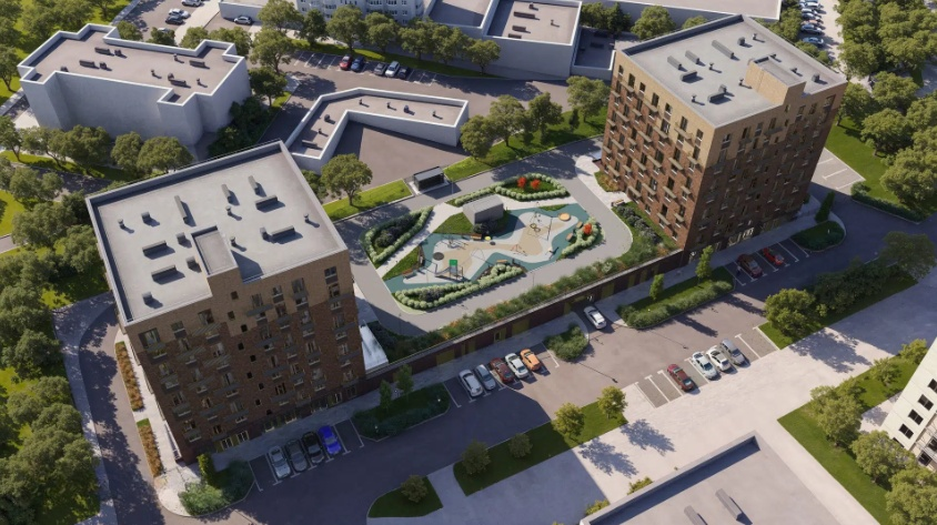 Двор, расположенный на стилобате это изолированное пространство, возвышающееся над уровнем улицы, на втором этаже между двумя зданиями.На стилобатной площадке будут размещены спортивные и игровые зоны, предназначенные как для детей, так и для взрослых. Это большая территория, предоставляет возможность для прогулок, занятий физической культурой и просто приятного времяпрепровождения.