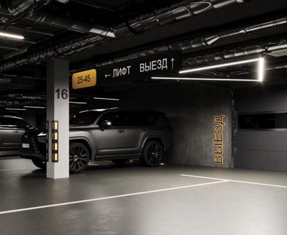 В здании стилобата предусмотрен тёплый паркинг, в который можно спустится на лифте. Это позволяет избежать необходимости предварительного прогрева автомобиля или очистки его от снега, что экономит драгоценное время и обеспечивает комфортный старт поездки.